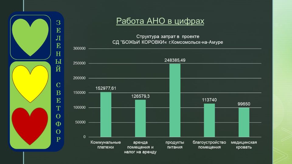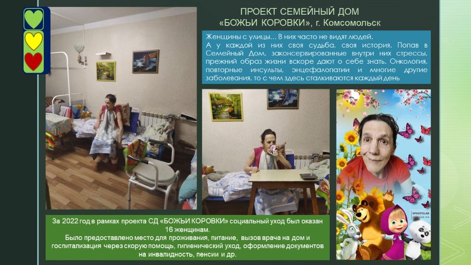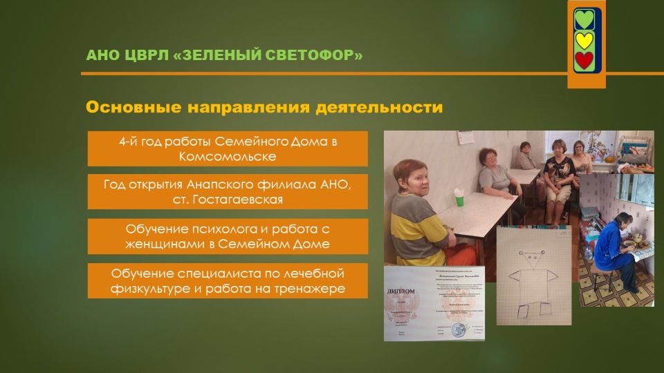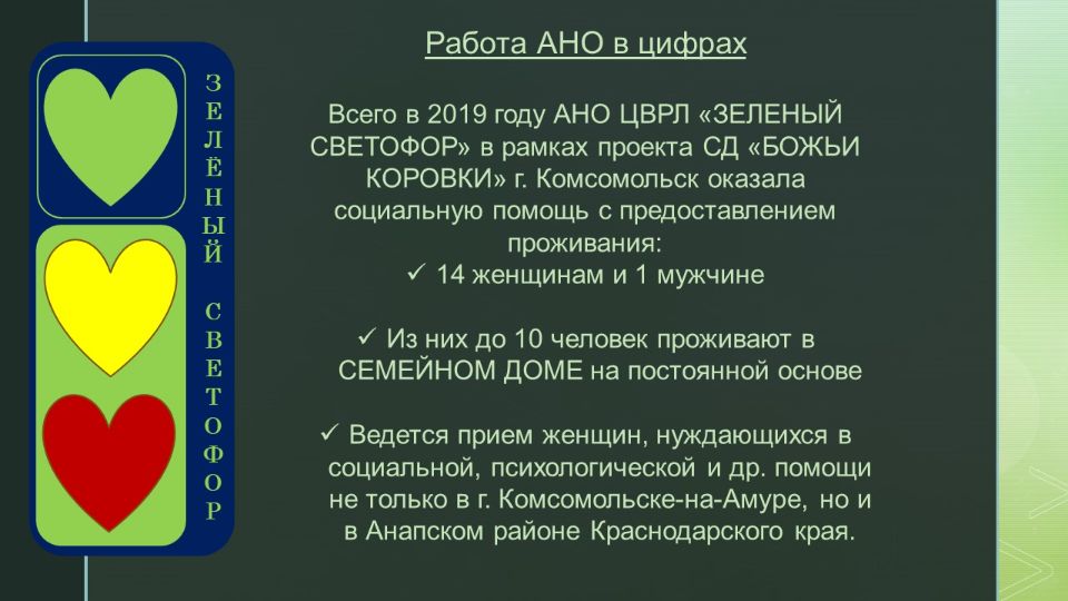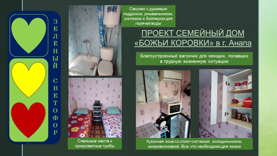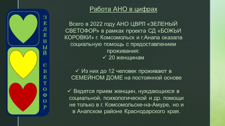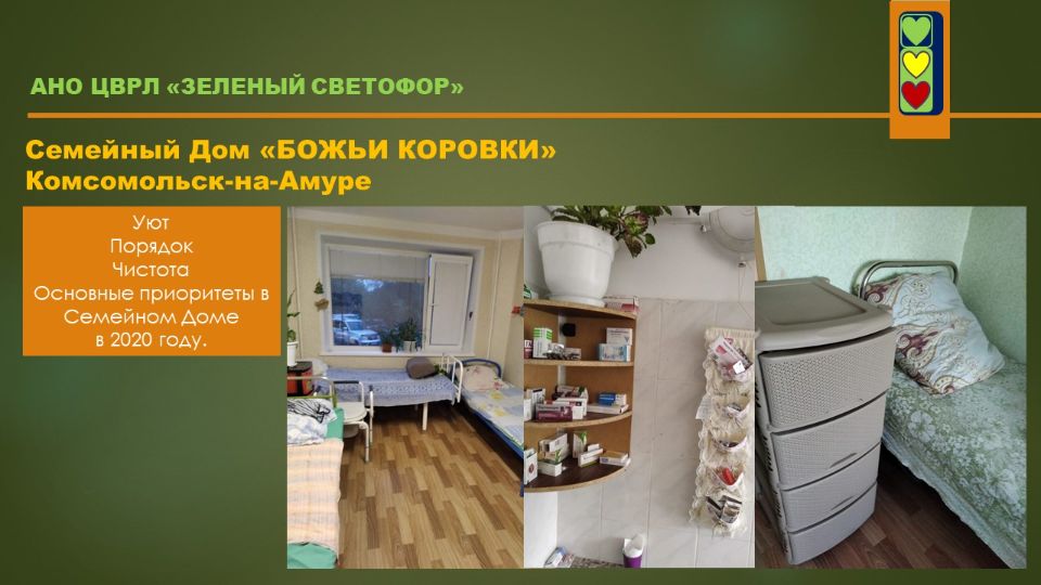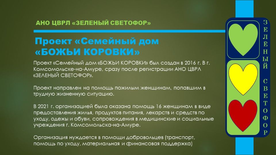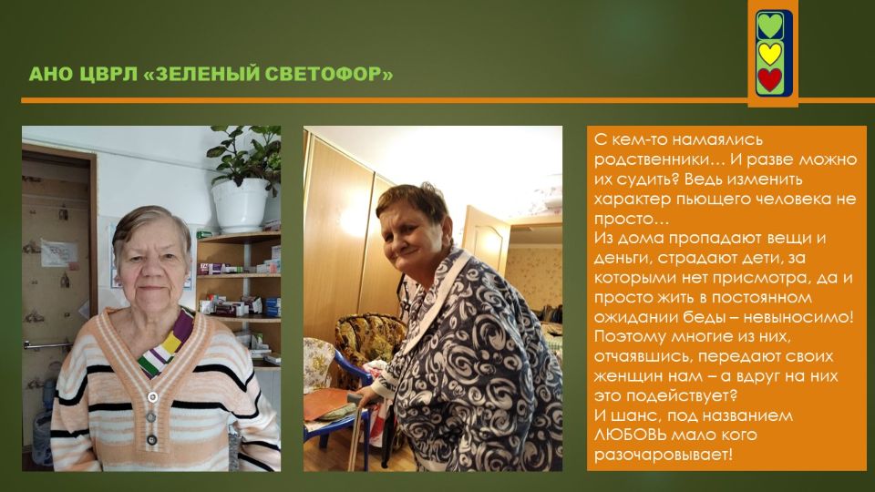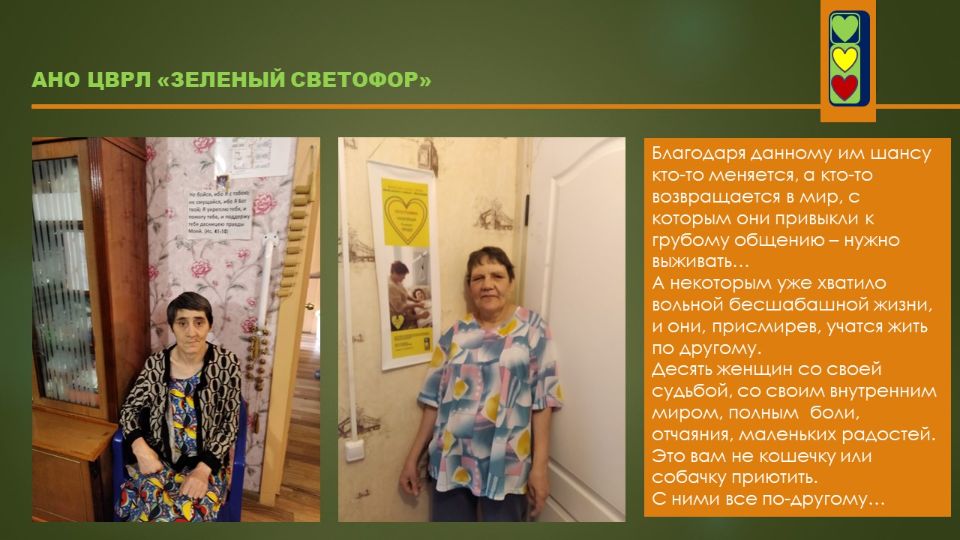 Этот проект дал начало организации. Именно с идеей создания приюта для бездомных женщин выступили организаторы АНО ЦВРЛ "ЗЕЛЕНЫЙ СВЕТОФОР" и она легла в основу нашей деятельности.
