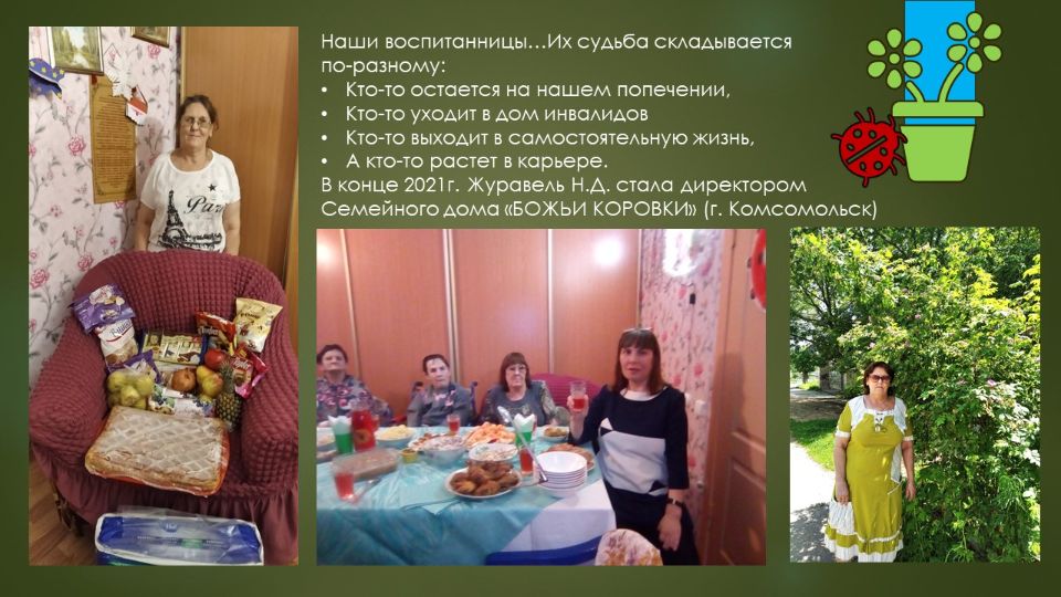 Стала чаще нам помогать, уже и стирала, и подгузники меняла, не гнушаясь никакой работой. И опять руководство заметило её старательность. Сначала поставили её заместителем директора. А когда бывший директор переехал в другой город, мы уже без сомнения, назначили Наталью Дмитриевну Журавель директором Семейного Дома "БОЖЬИ КОРОВКИ".