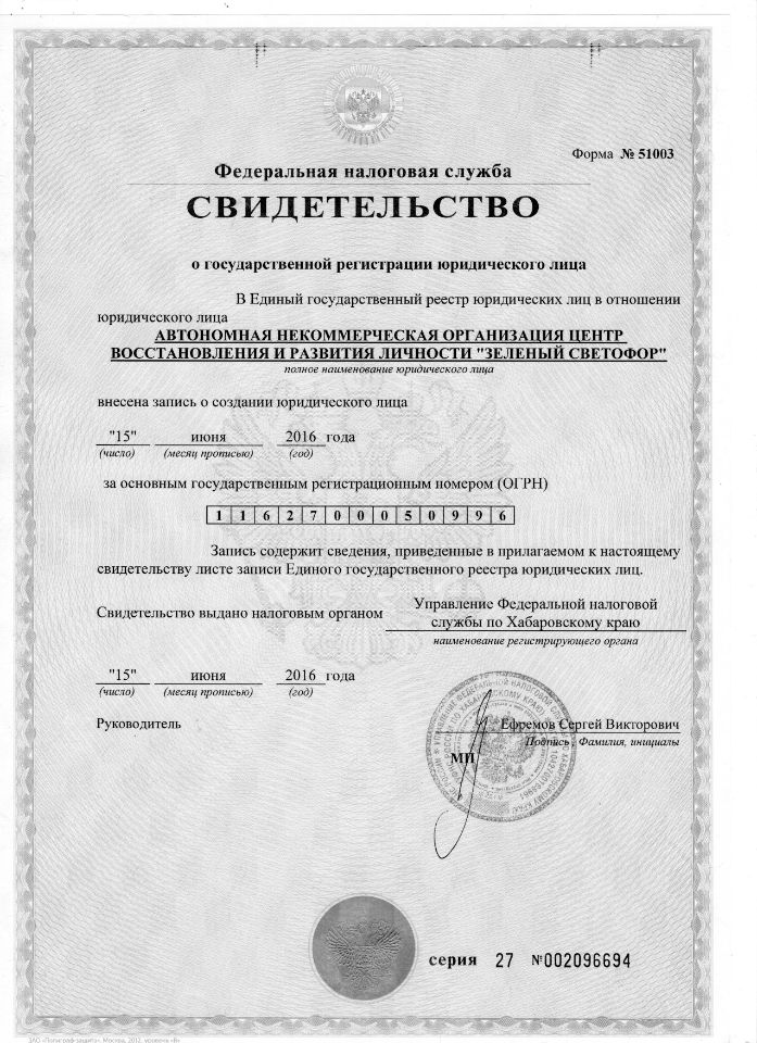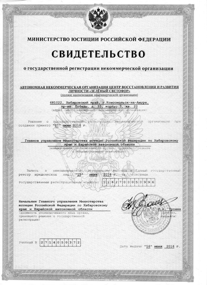 выдано ГУ Министерства юстиции РФ по Хабаровскому краю и Еврейской автономной области